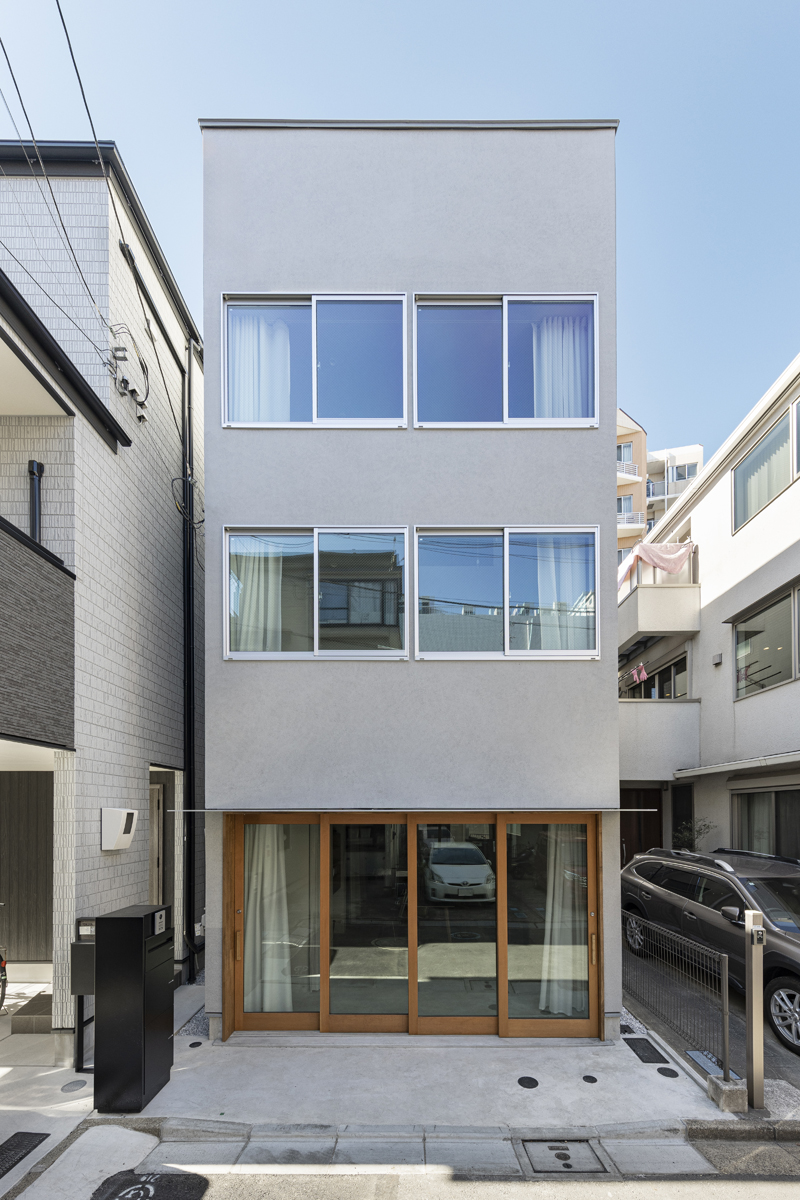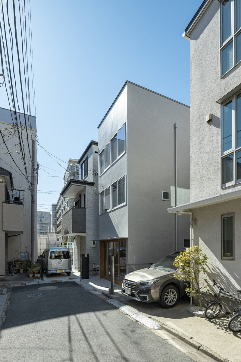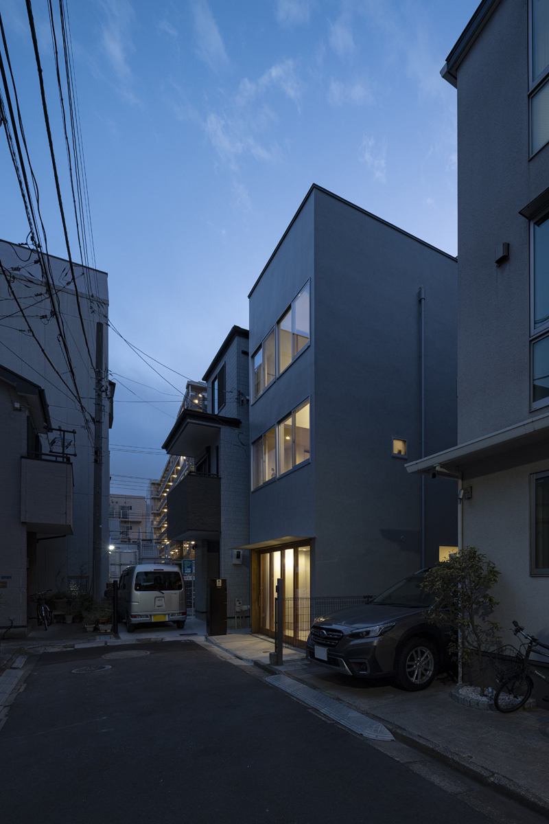 この建築は東京都江東区平野に建つ住宅である。平野は清澄白河から深川、門前仲町へ向かう途中に位置し、美術館や庭園、カフェやショップ、寺院など多様な建物が点在していることにより、散策でにぎわう街となっている。敷地は散策路から少し離れた袋路の奥にあり、暮らすには静かで良好な環境だが、人の気配は減り、閉じた印象であった。