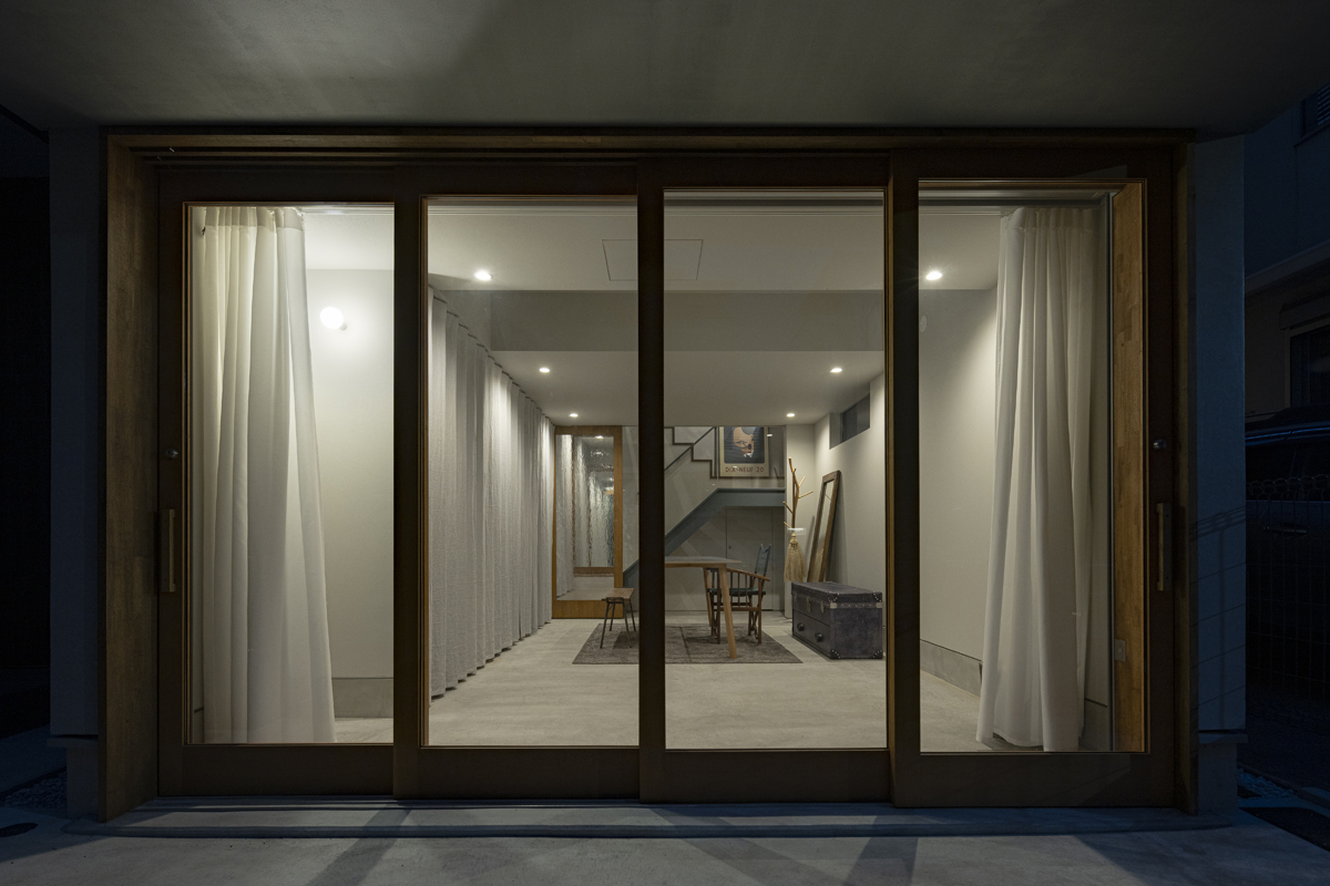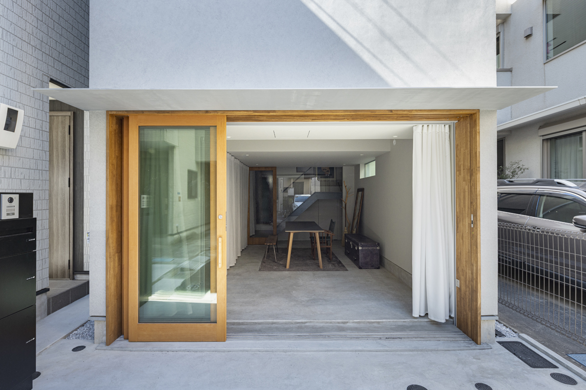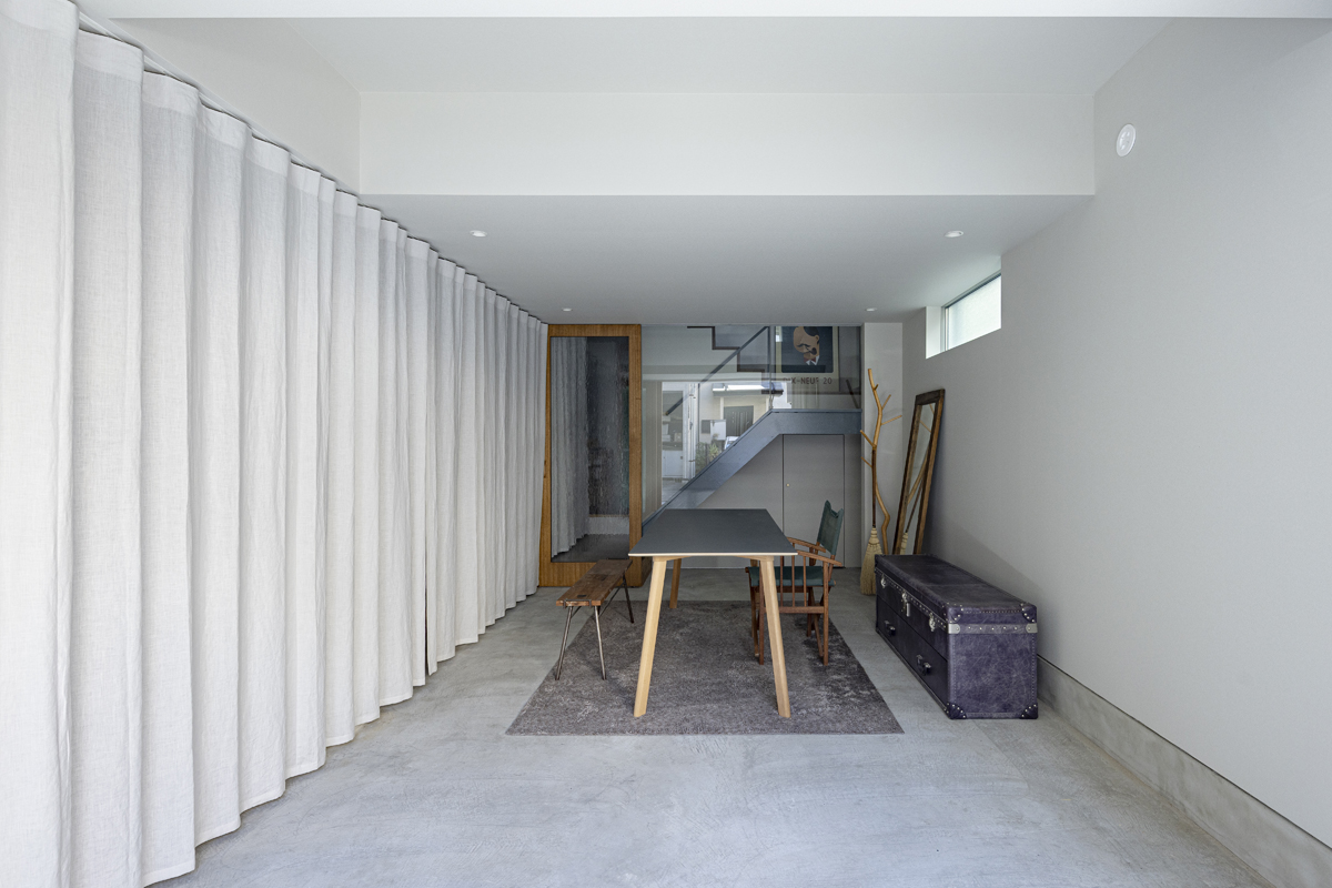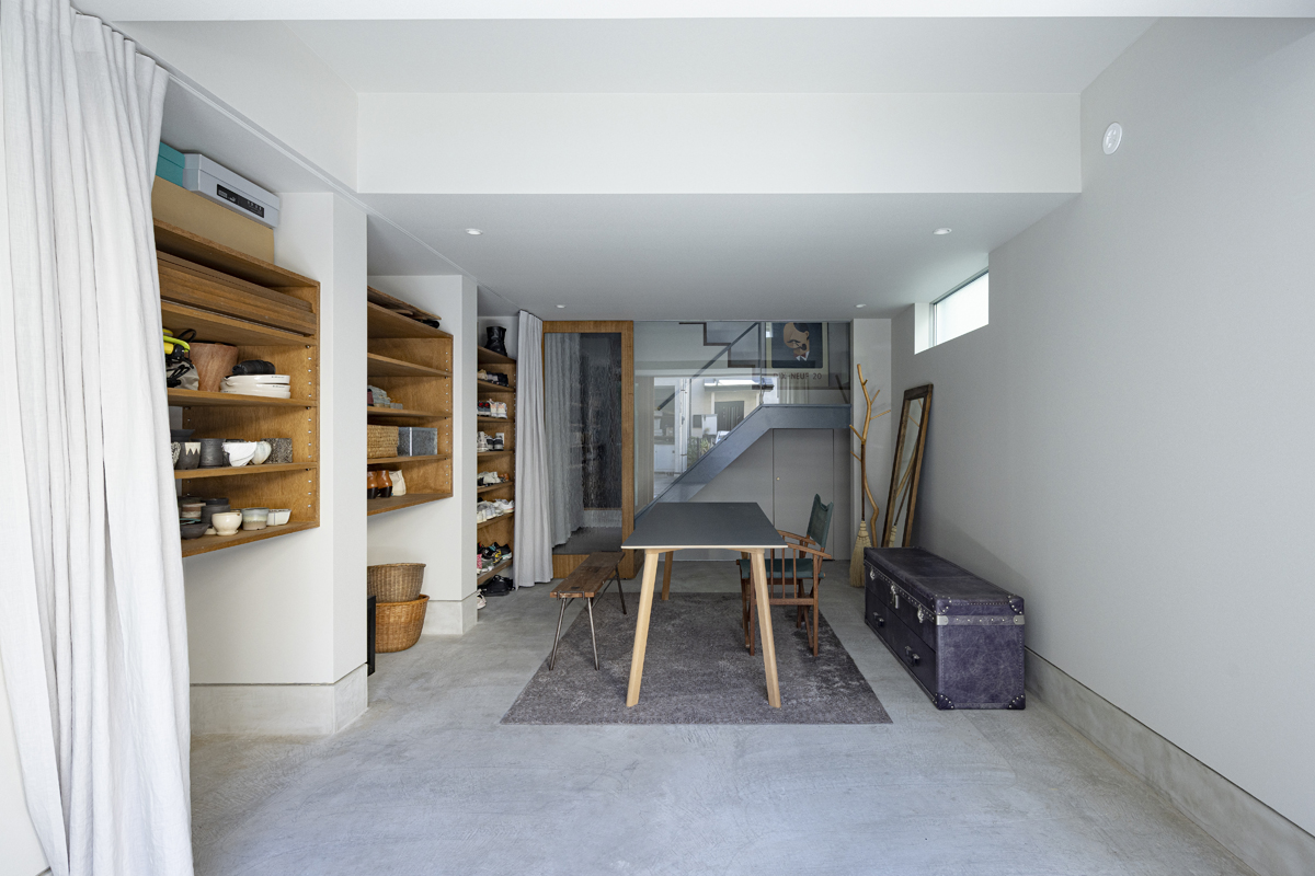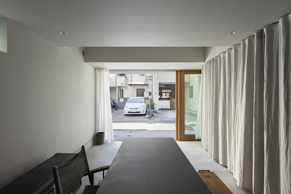 1階の袋路側は土間を設け、広く街へ開くことができるものとした。土間は近隣住人や友人が集う場、子どもの遊び場、工作場やガレージ、そして将来は見世蔵のように街に開いたギャラリーやショップなどに転用することができる懐の広いものとした。それは住宅が他者に対し完全に閉じるのではなく、他者に開き、関わりながら暮らすことで、この袋路に少しの動きを与える。