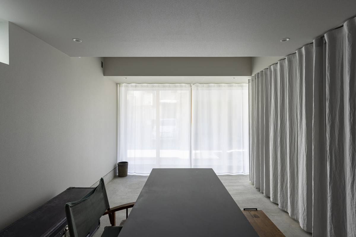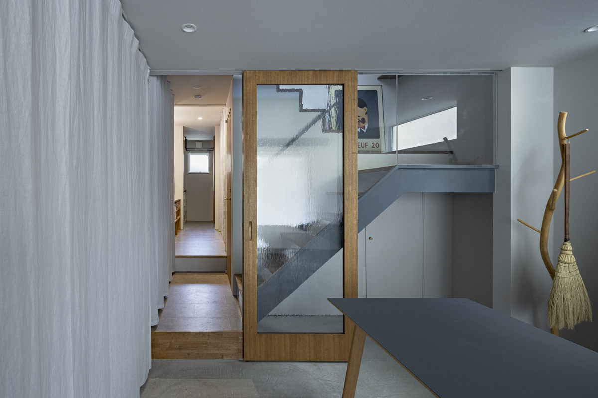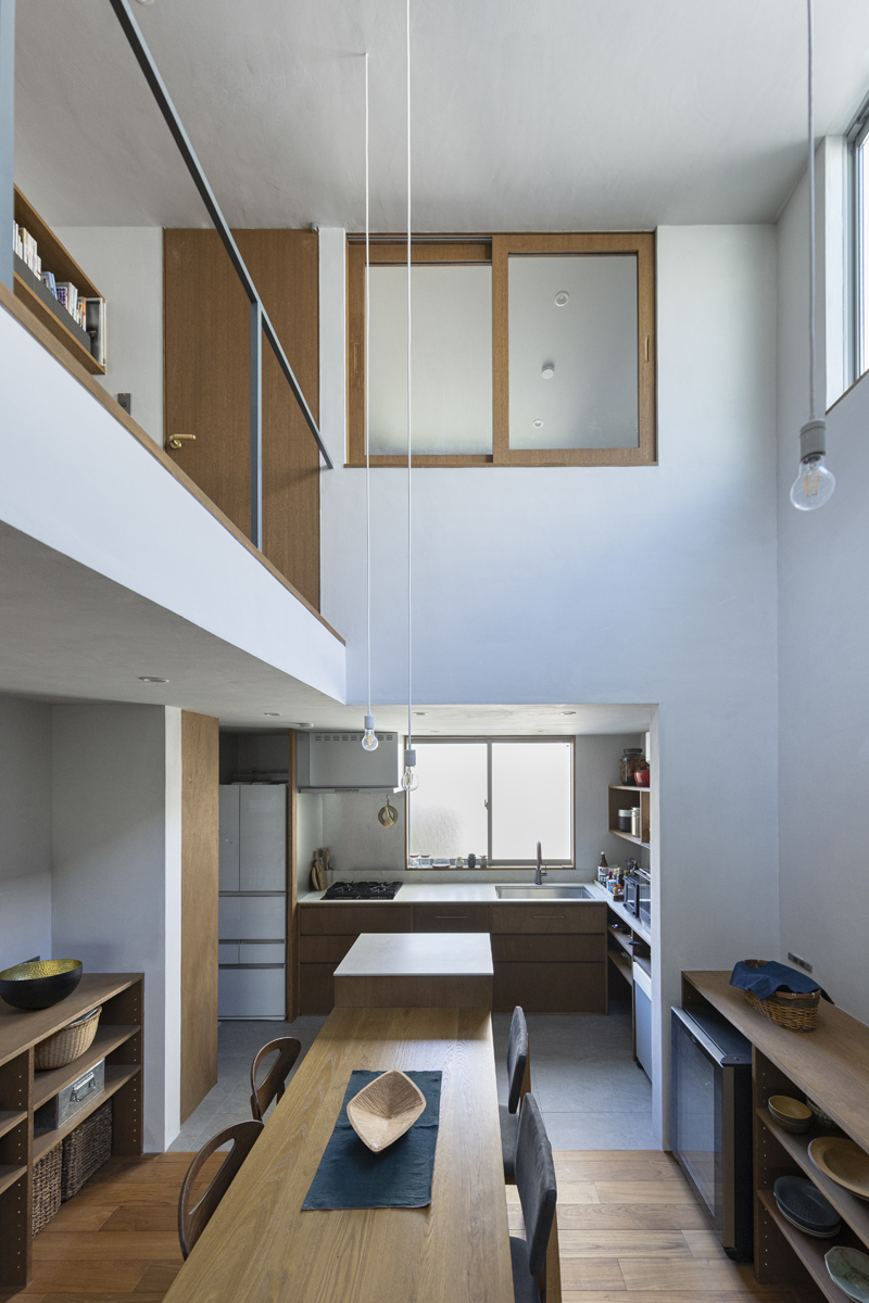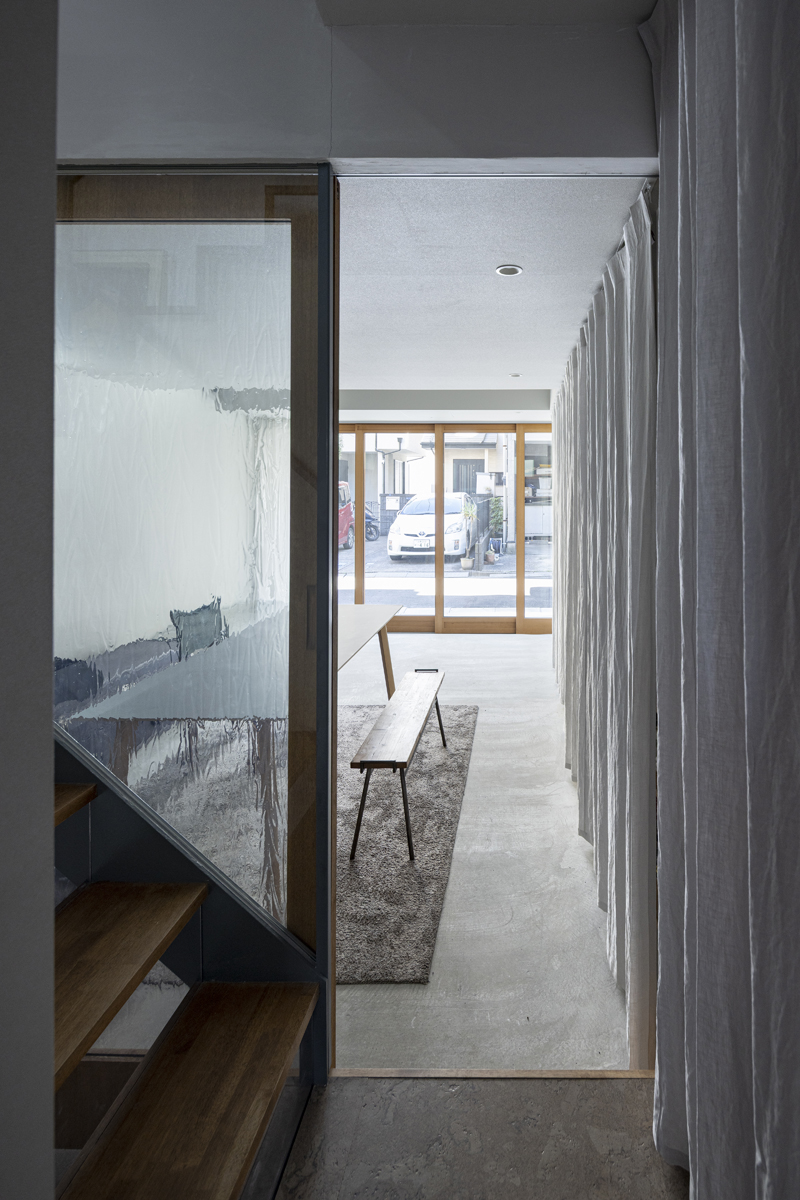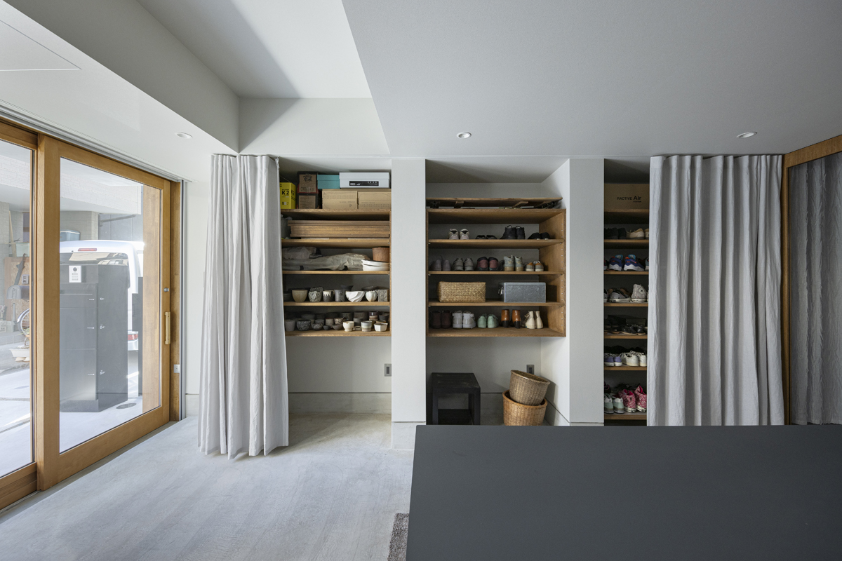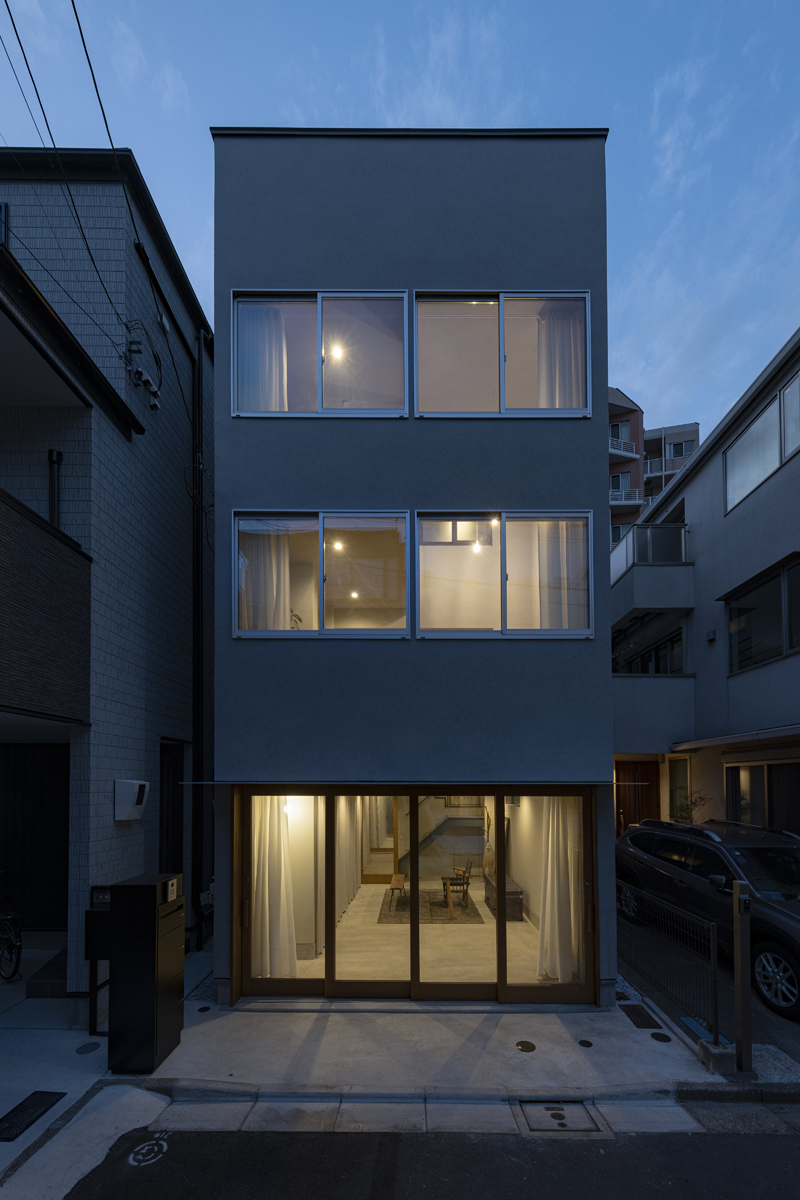 1階の袋路側は土間を設け、広く街へ開くことができるものとした。土間は近隣住人や友人が集う場、子どもの遊び場、工作場やガレージ、そして将来は見世蔵のように街に開いたギャラリーやショップなどに転用することができる懐の広いものとした。それは住宅が他者に対し完全に閉じるのではなく、他者に開き、関わりながら暮らすことで、この袋路に少しの動きを与える。