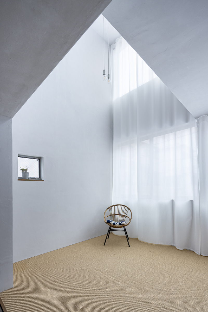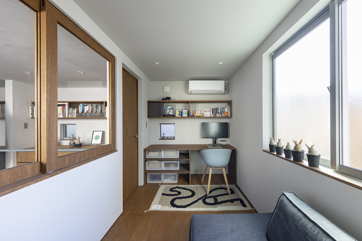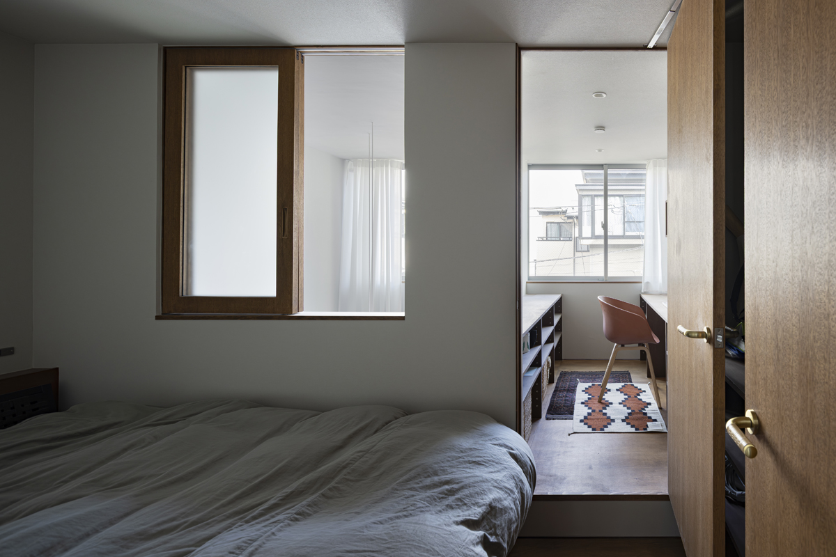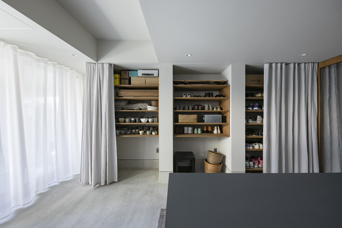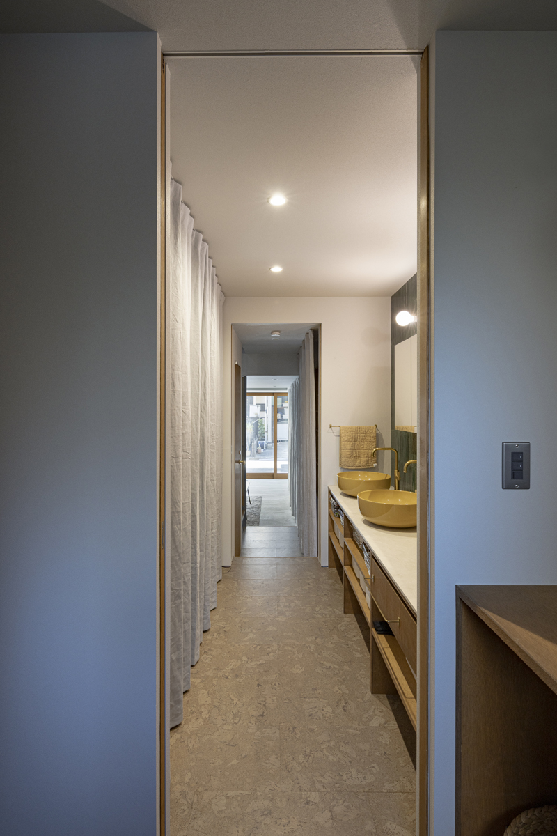 1階の袋路側は土間を設け、広く街へ開くことができるものとした。土間は近隣住人や友人が集う場、子どもの遊び場、工作場やガレージ、そして将来は見世蔵のように街に開いたギャラリーやショップなどに転用することができる懐の広いものとした。それは住宅が他者に対し完全に閉じるのではなく、他者に開き、関わりながら暮らすことで、この袋路に少しの動きを与える。