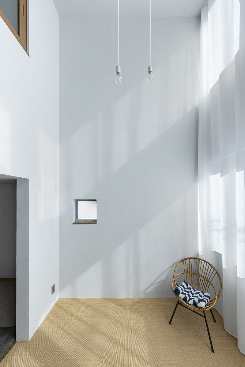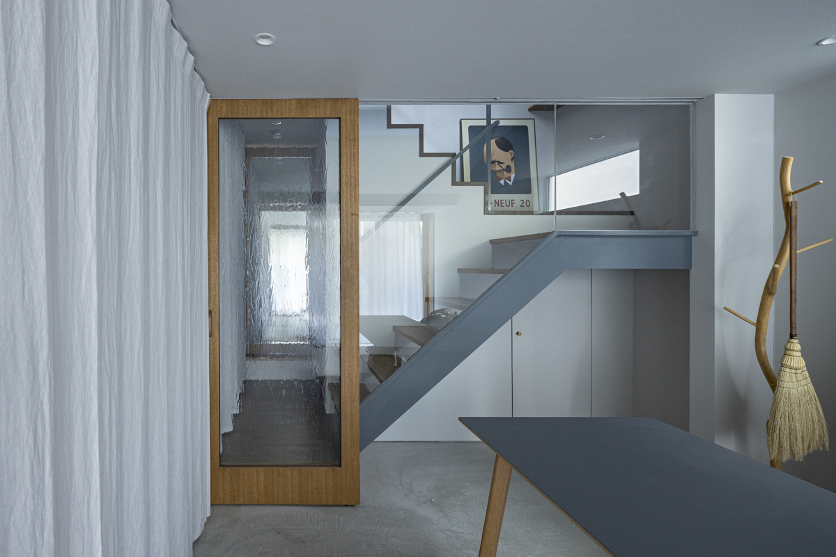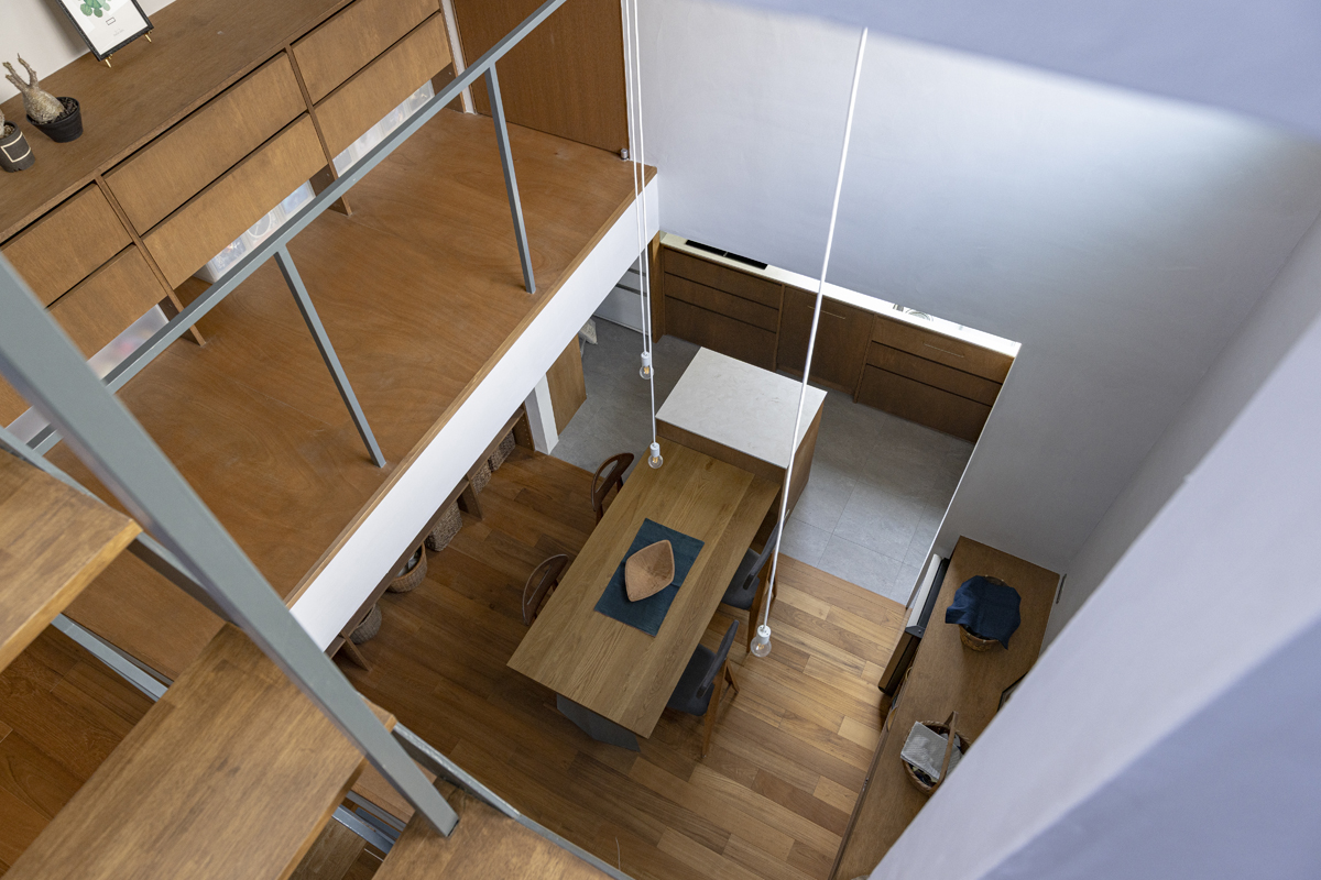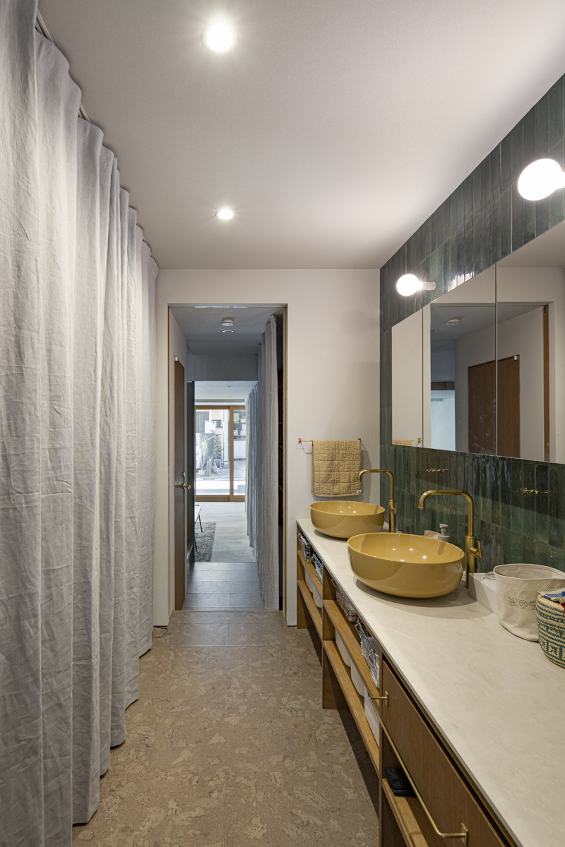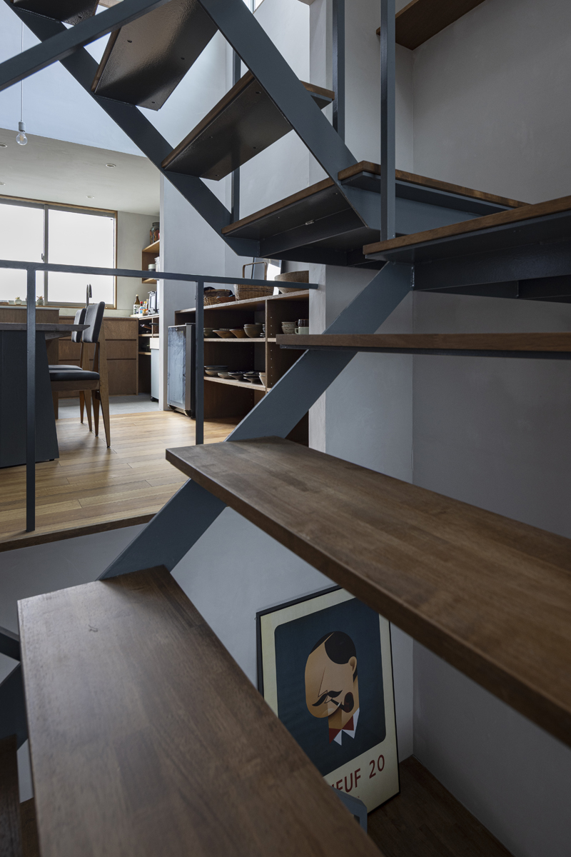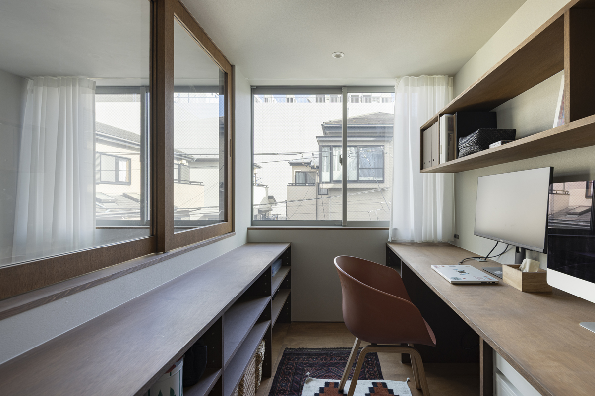 1階の袋路側は土間を設け、広く街へ開くことができるものとした。土間は近隣住人や友人が集う場、子どもの遊び場、工作場やガレージ、そして将来は見世蔵のように街に開いたギャラリーやショップなどに転用することができる懐の広いものとした。それは住宅が他者に対し完全に閉じるのではなく、他者に開き、関わりながら暮らすことで、この袋路に少しの動きを与える。