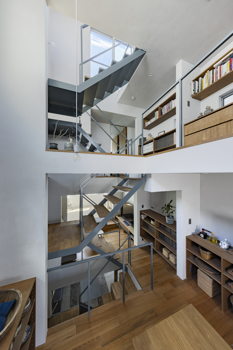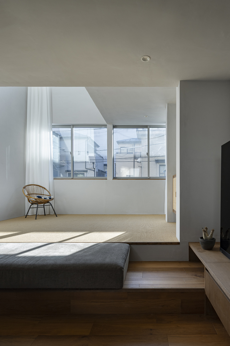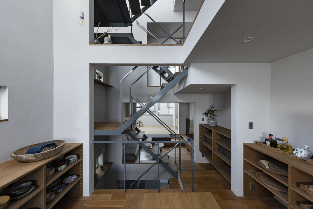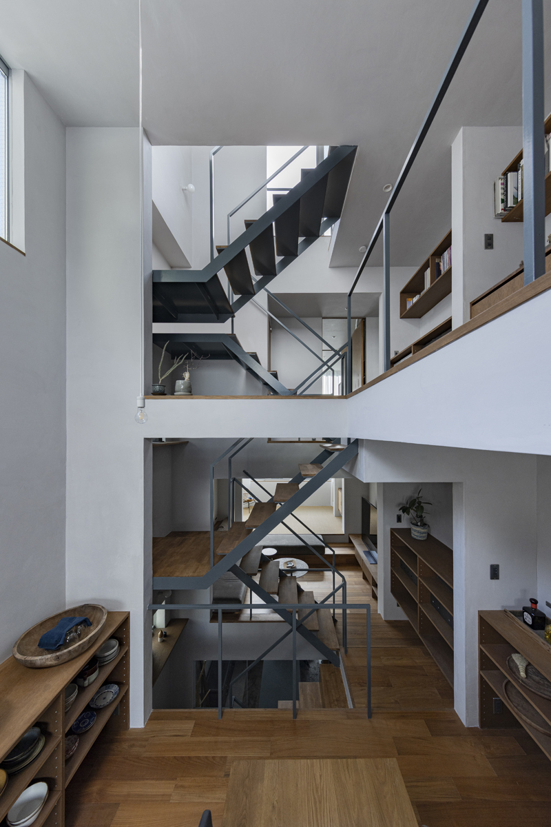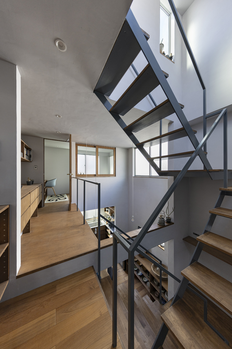 1階の一部と2階、3階、屋上階へと上に積まれる暮らしを支える場は、水平な床を単純に重ね、各階を分け隔てたものとはせずに、暮らしの場のそれぞれを構造壁が枠取ることにより緩やかに分け、さらにその場に合せた広さや床高さ、天井高さをもつ段床が伸びやかに連なるものとした。そして平面中央の階段が、1階の土間を含めてひとつに紡ぐ。それは蔵にある多種多様な品々が、その大きさや性質に分けられ、連なり、見渡すことができるように、3階建てという上に積まれた都市的な暮らしに分節と連関、統合を与え、光と風の流れ、家族の居場所とその気配、空間の奥行きとつながりなど、様々な関係性を豊かに広げる。
