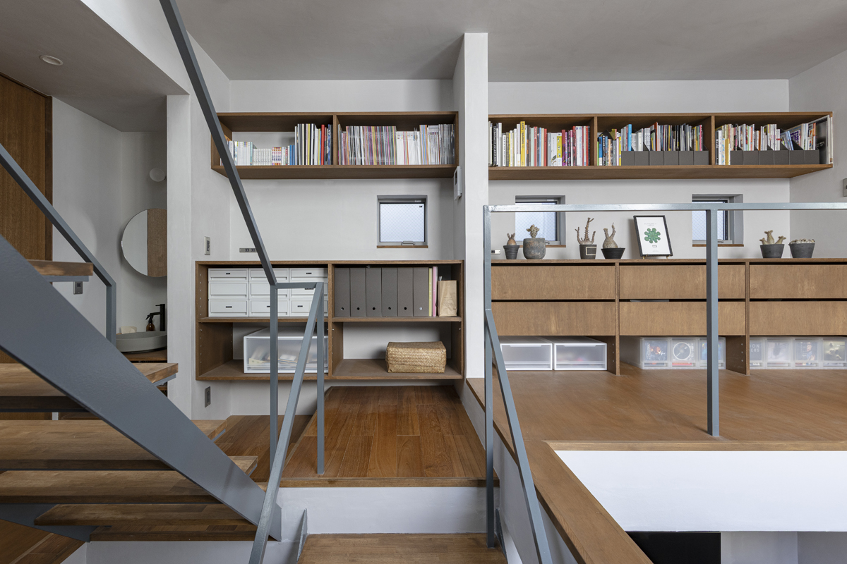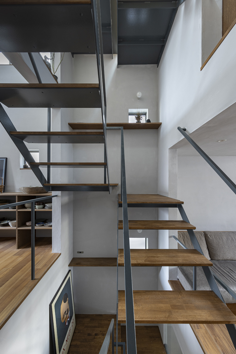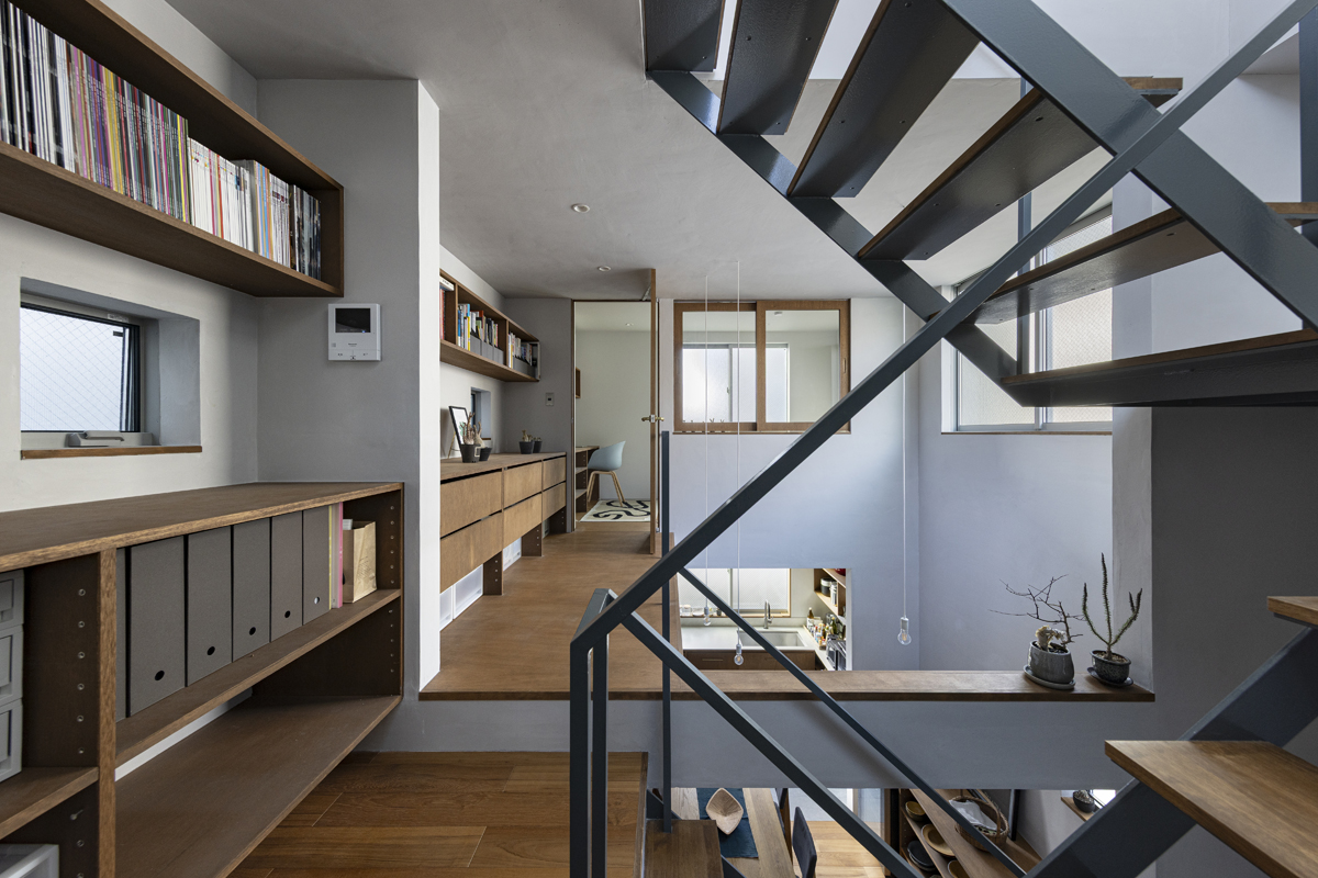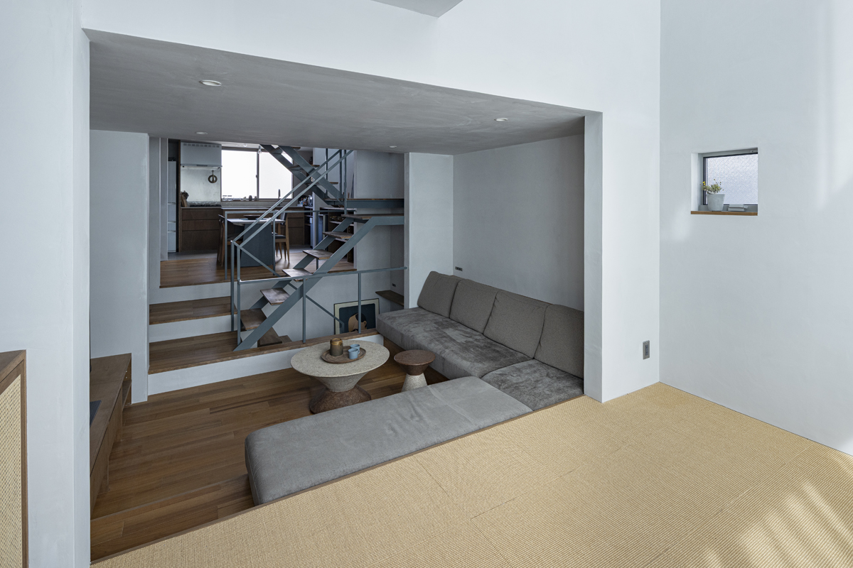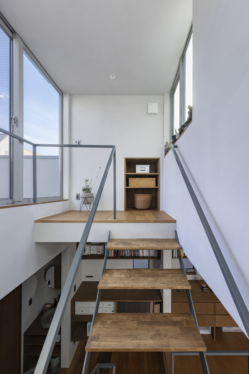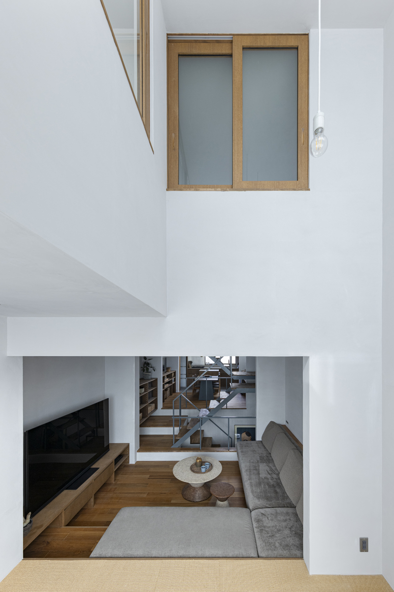 1階の一部と2階、3階、屋上階へと上に積まれる暮らしを支える場は、水平な床を単純に重ね、各階を分け隔てたものとはせずに、暮らしの場のそれぞれを構造壁が枠取ることにより緩やかに分け、さらにその場に合せた広さや床高さ、天井高さをもつ段床が伸びやかに連なるものとした。そして平面中央の階段が、1階の土間を含めてひとつに紡ぐ。それは蔵にある多種多様な品々が、その大きさや性質に分けられ、連なり、見渡すことができるように、3階建てという上に積まれた都市的な暮らしに分節と連関、統合を与え、光と風の流れ、家族の居場所とその気配、空間の奥行きとつながりなど、様々な関係性を豊かに広げる。