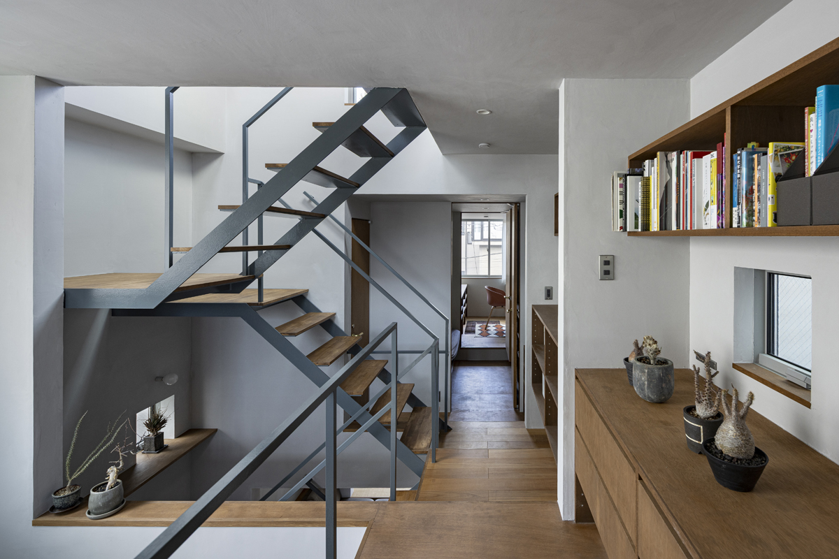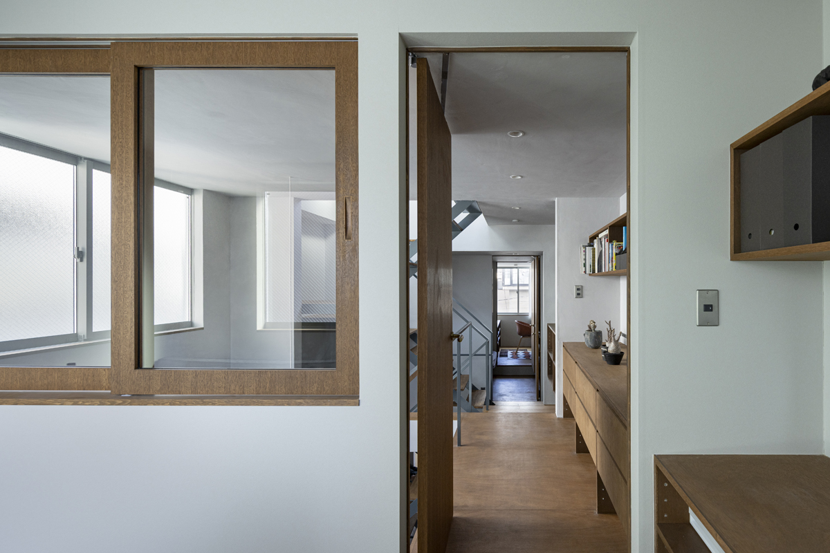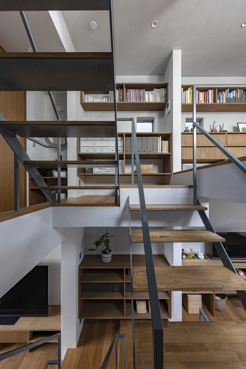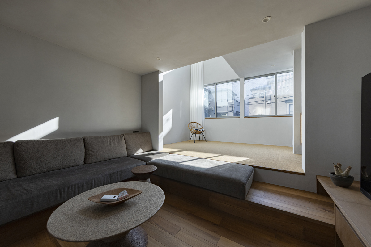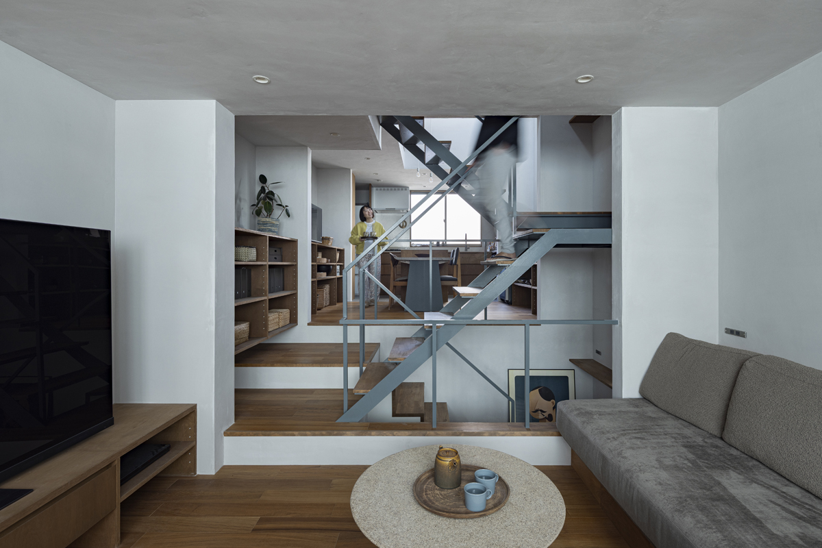 1階の一部と2階、3階、屋上階へと上に積まれる暮らしを支える場は、水平な床を単純に重ね、各階を分け隔てたものとはせずに、暮らしの場のそれぞれを構造壁が枠取ることにより緩やかに分け、さらにその場に合せた広さや床高さ、天井高さをもつ段床が伸びやかに連なるものとした。そして平面中央の階段が、1階の土間を含めてひとつに紡ぐ。それは蔵にある多種多様な品々が、その大きさや性質に分けられ、連なり、見渡すことができるように、3階建てという上に積まれた都市的な暮らしに分節と連関、統合を与え、光と風の流れ、家族の居場所とその気配、空間の奥行きとつながりなど、様々な関係性を豊かに広げる。