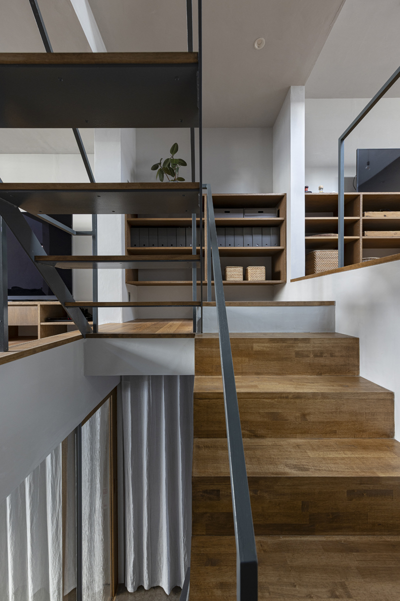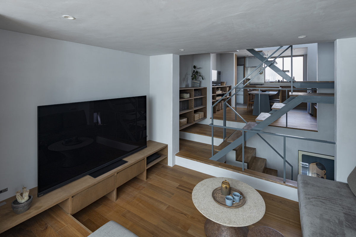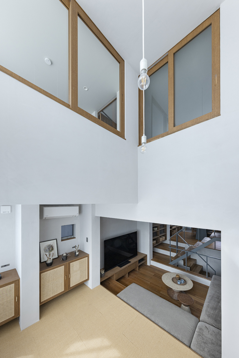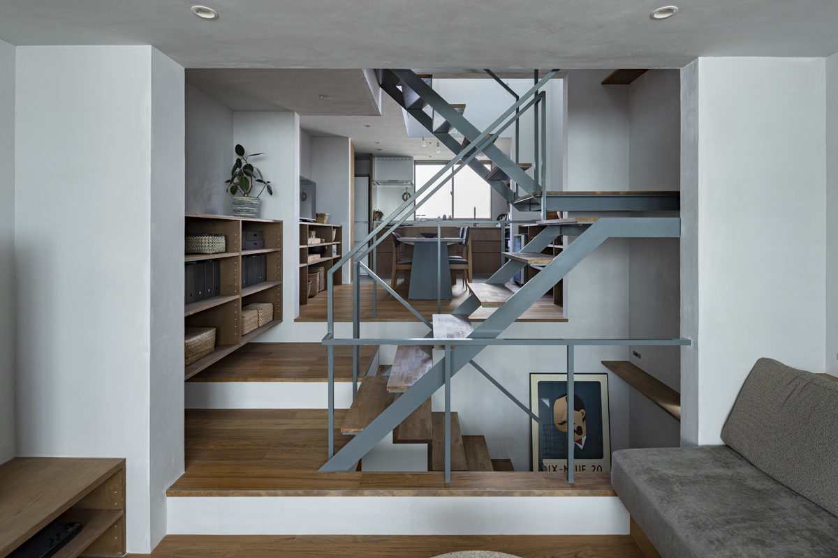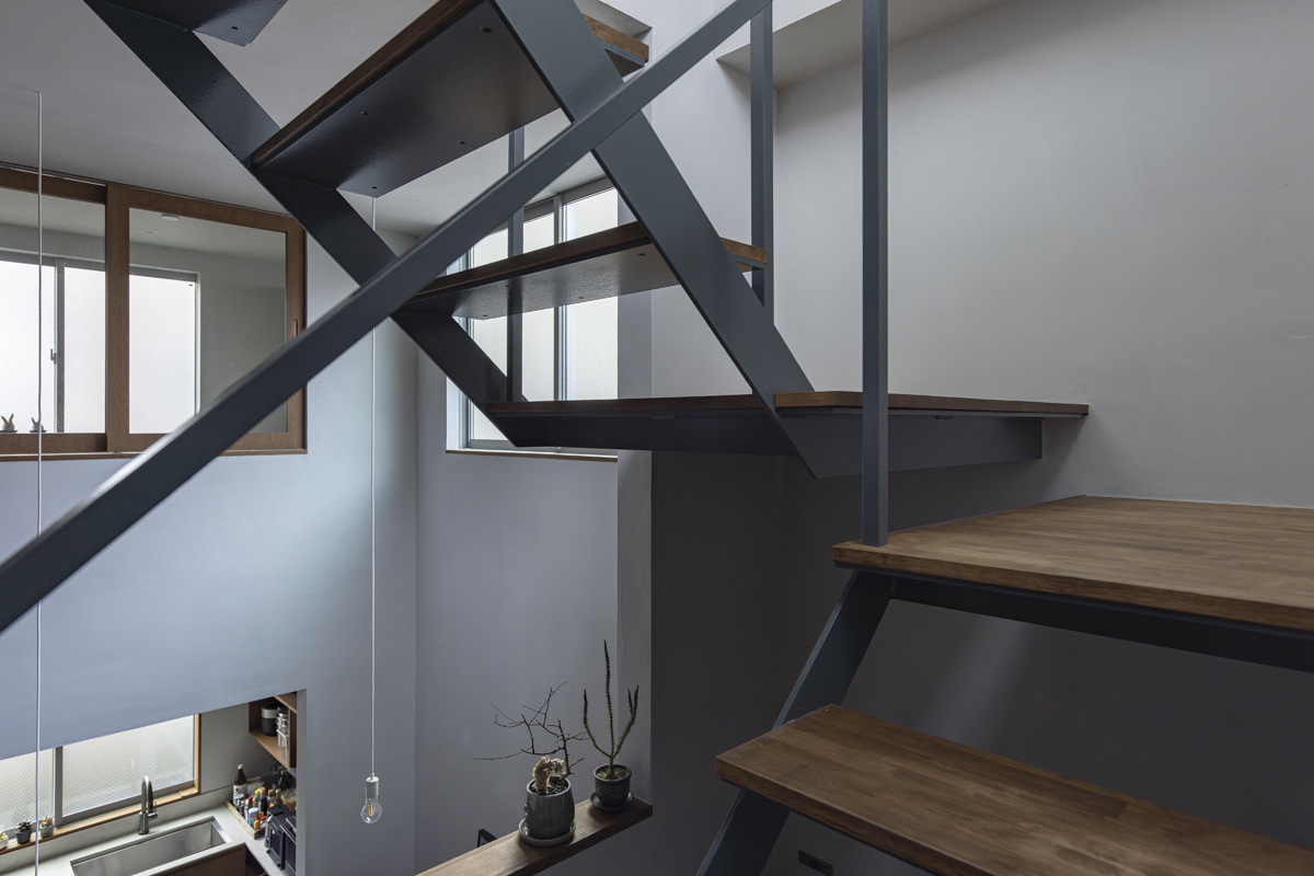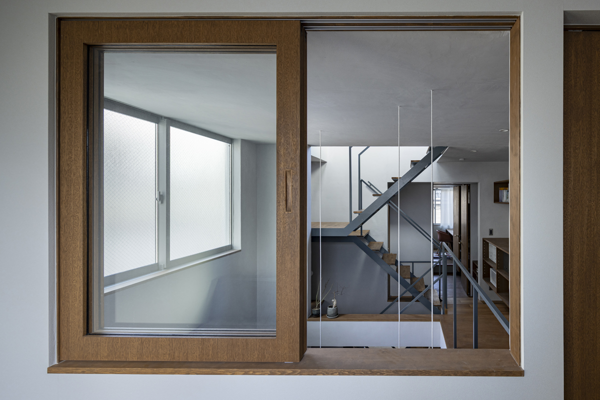 1階の一部と2階、3階、屋上階へと上に積まれる暮らしを支える場は、水平な床を単純に重ね、各階を分け隔てたものとはせずに、暮らしの場のそれぞれを構造壁が枠取ることにより緩やかに分け、さらにその場に合せた広さや床高さ、天井高さをもつ段床が伸びやかに連なるものとした。そして平面中央の階段が、1階の土間を含めてひとつに紡ぐ。それは蔵にある多種多様な品々が、その大きさや性質に分けられ、連なり、見渡すことができるように、3階建てという上に積まれた都市的な暮らしに分節と連関、統合を与え、光と風の流れ、家族の居場所とその気配、空間の奥行きとつながりなど、様々な関係性を豊かに広げる。