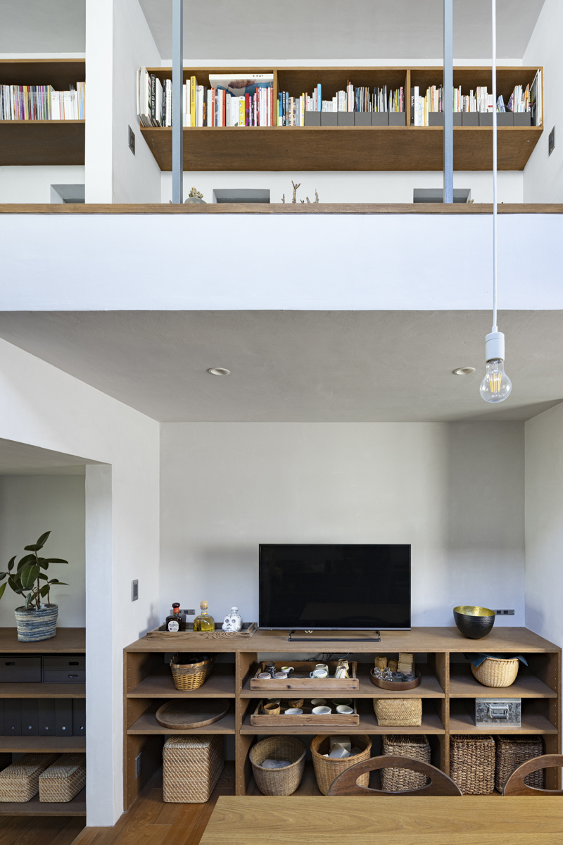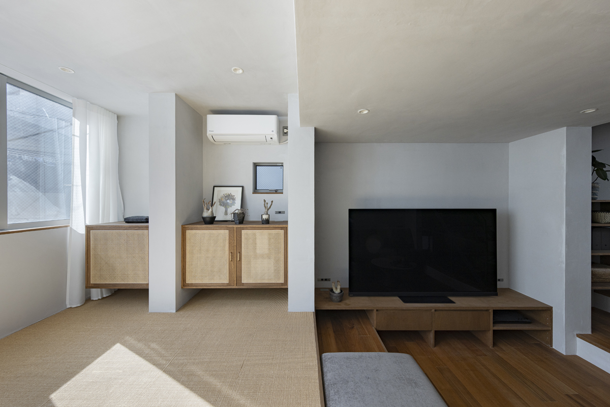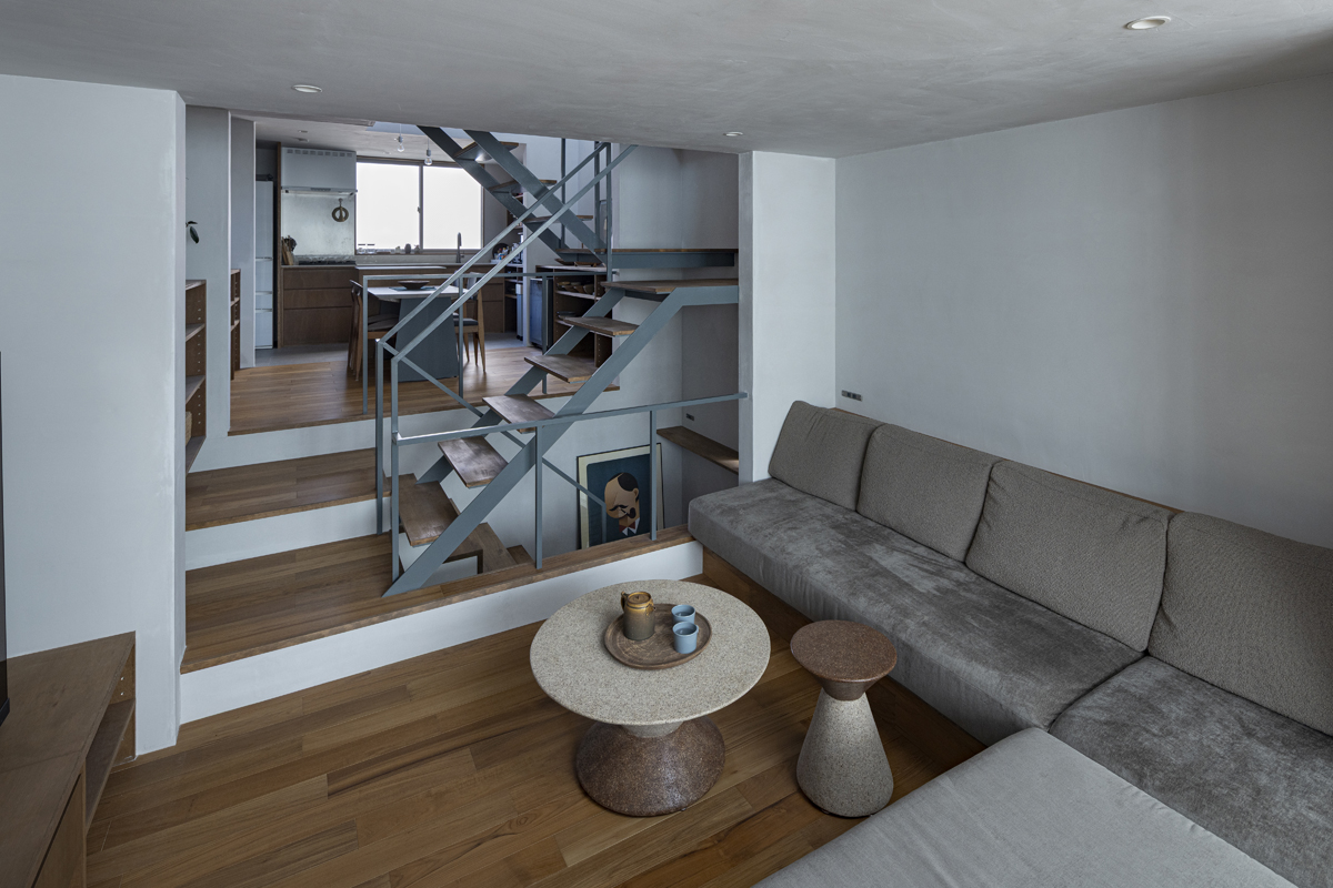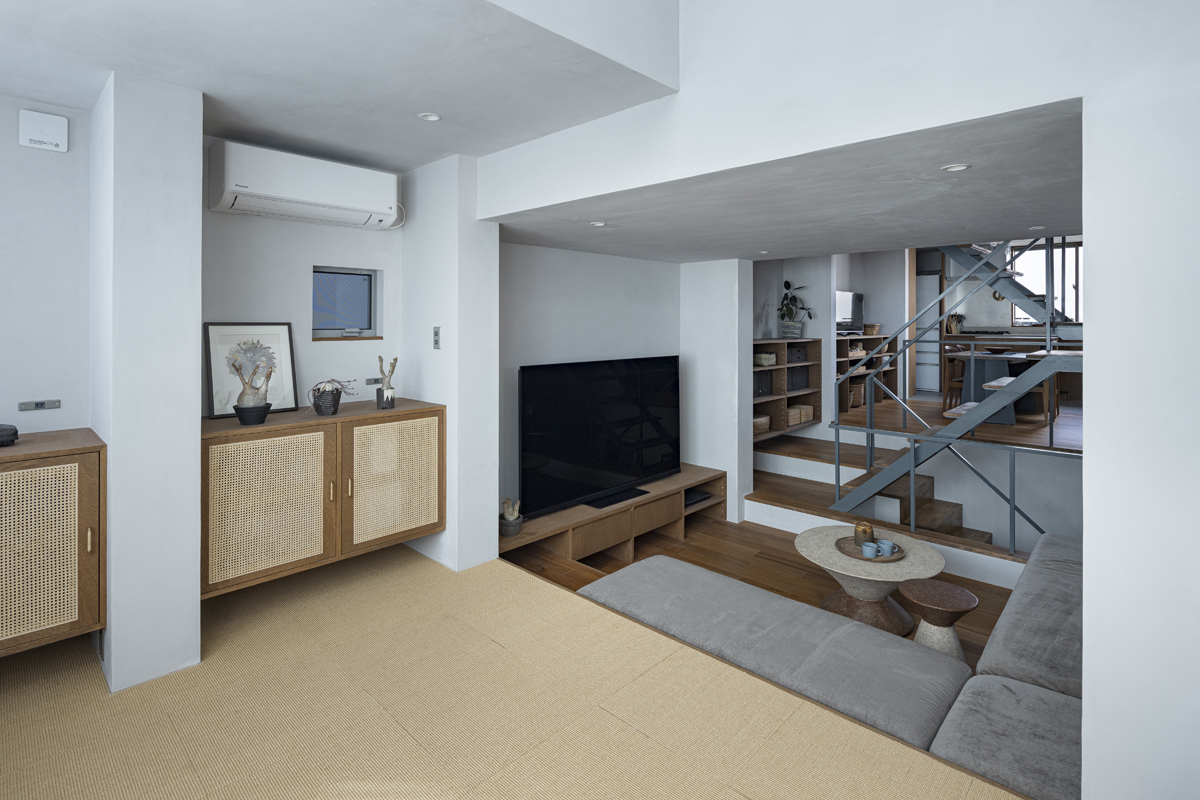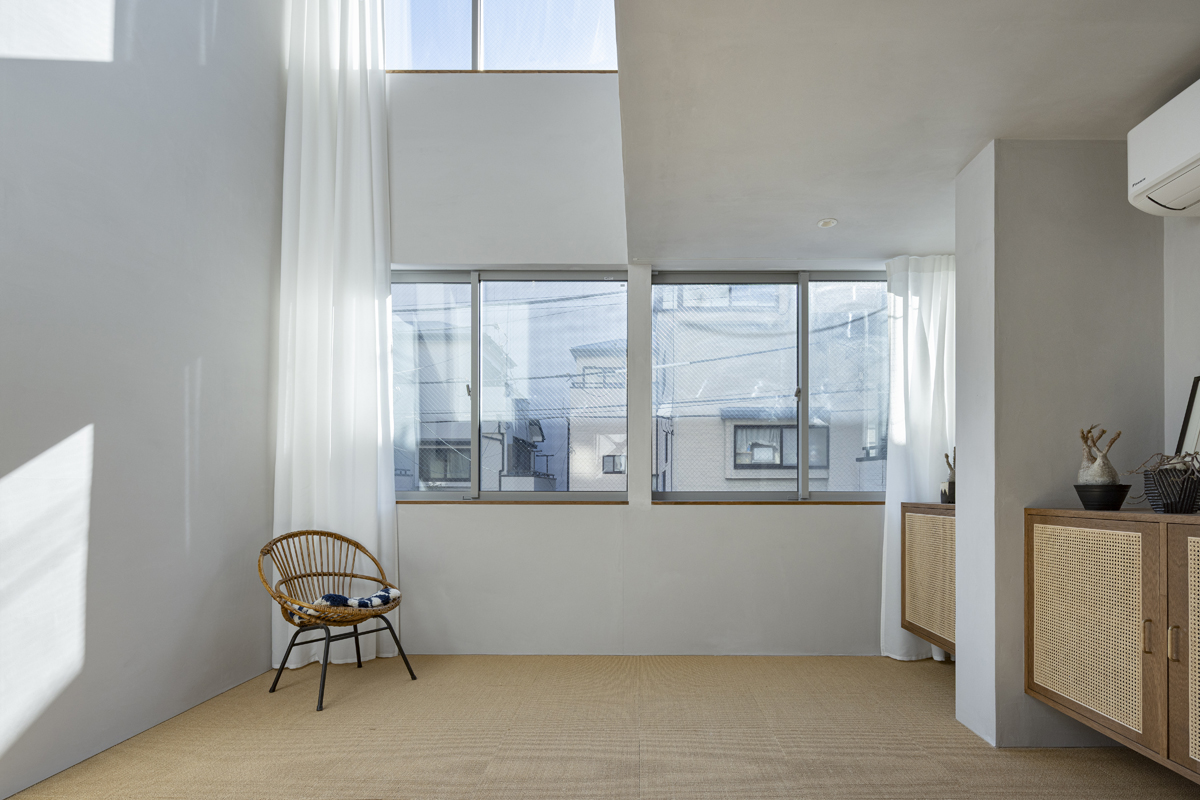 1階の一部と2階、3階、屋上階へと上に積まれる暮らしを支える場は、水平な床を単純に重ね、各階を分け隔てたものとはせずに、暮らしの場のそれぞれを構造壁が枠取ることにより緩やかに分け、さらにその場に合せた広さや床高さ、天井高さをもつ段床が伸びやかに連なるものとした。そして平面中央の階段が、1階の土間を含めてひとつに紡ぐ。それは蔵にある多種多様な品々が、その大きさや性質に分けられ、連なり、見渡すことができるように、3階建てという上に積まれた都市的な暮らしに分節と連関、統合を与え、光と風の流れ、家族の居場所とその気配、空間の奥行きとつながりなど、様々な関係性を豊かに広げる。
