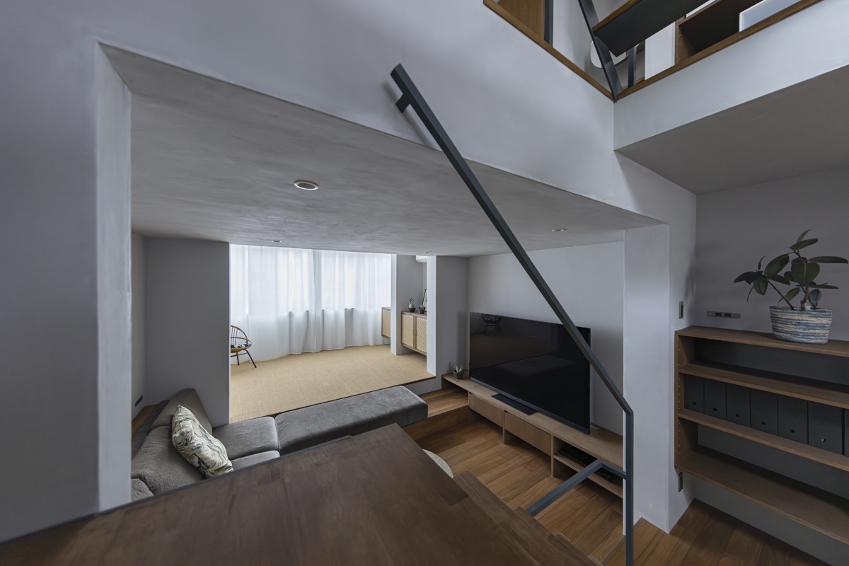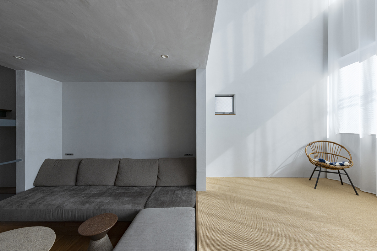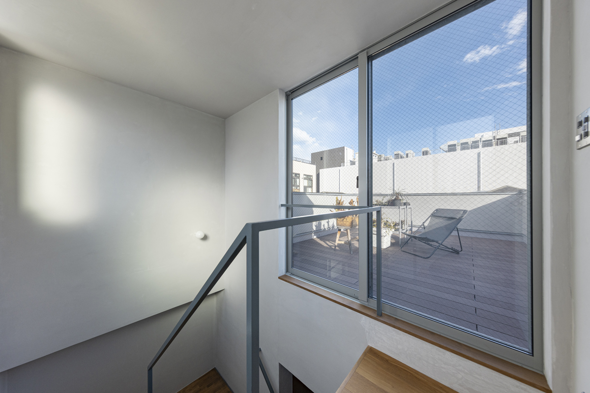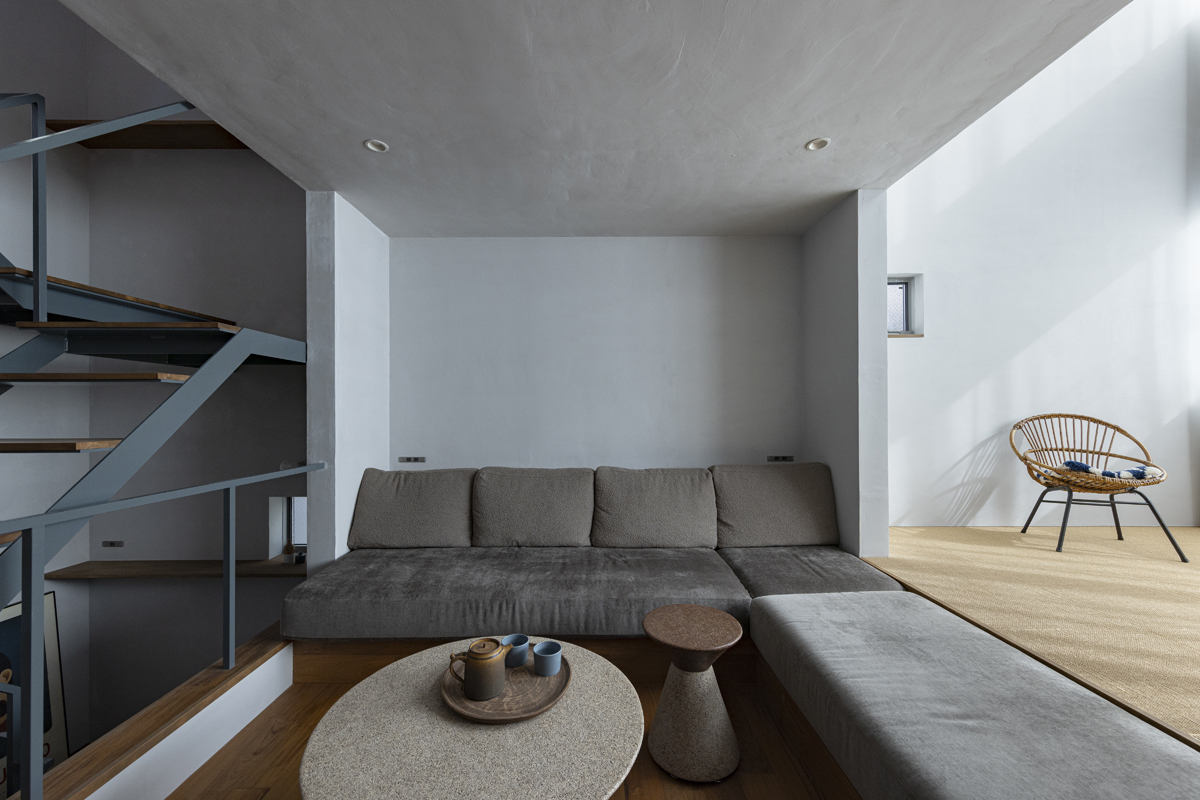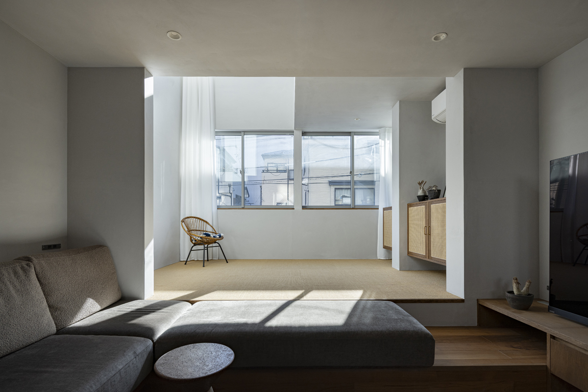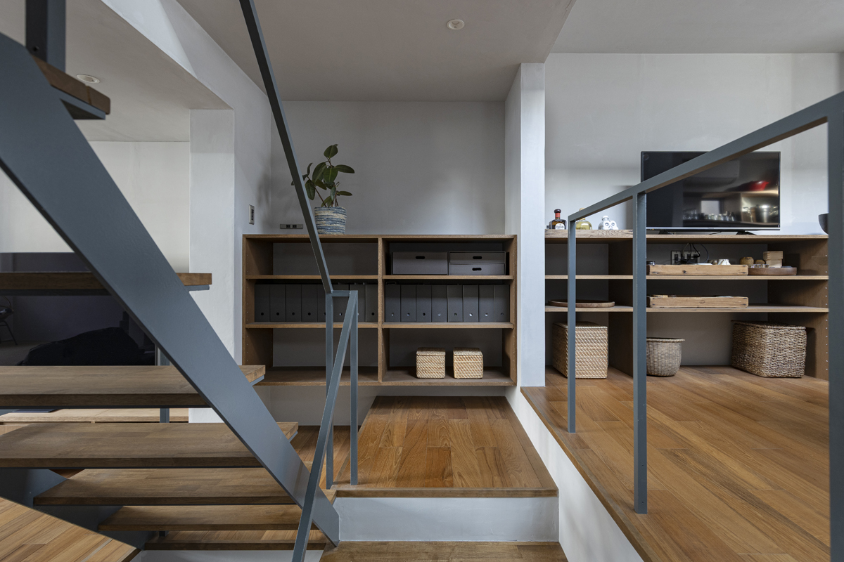 1階の一部と2階、3階、屋上階へと上に積まれる暮らしを支える場は、水平な床を単純に重ね、各階を分け隔てたものとはせずに、暮らしの場のそれぞれを構造壁が枠取ることにより緩やかに分け、さらにその場に合せた広さや床高さ、天井高さをもつ段床が伸びやかに連なるものとした。そして平面中央の階段が、1階の土間を含めてひとつに紡ぐ。それは蔵にある多種多様な品々が、その大きさや性質に分けられ、連なり、見渡すことができるように、3階建てという上に積まれた都市的な暮らしに分節と連関、統合を与え、光と風の流れ、家族の居場所とその気配、空間の奥行きとつながりなど、様々な関係性を豊かに広げる。