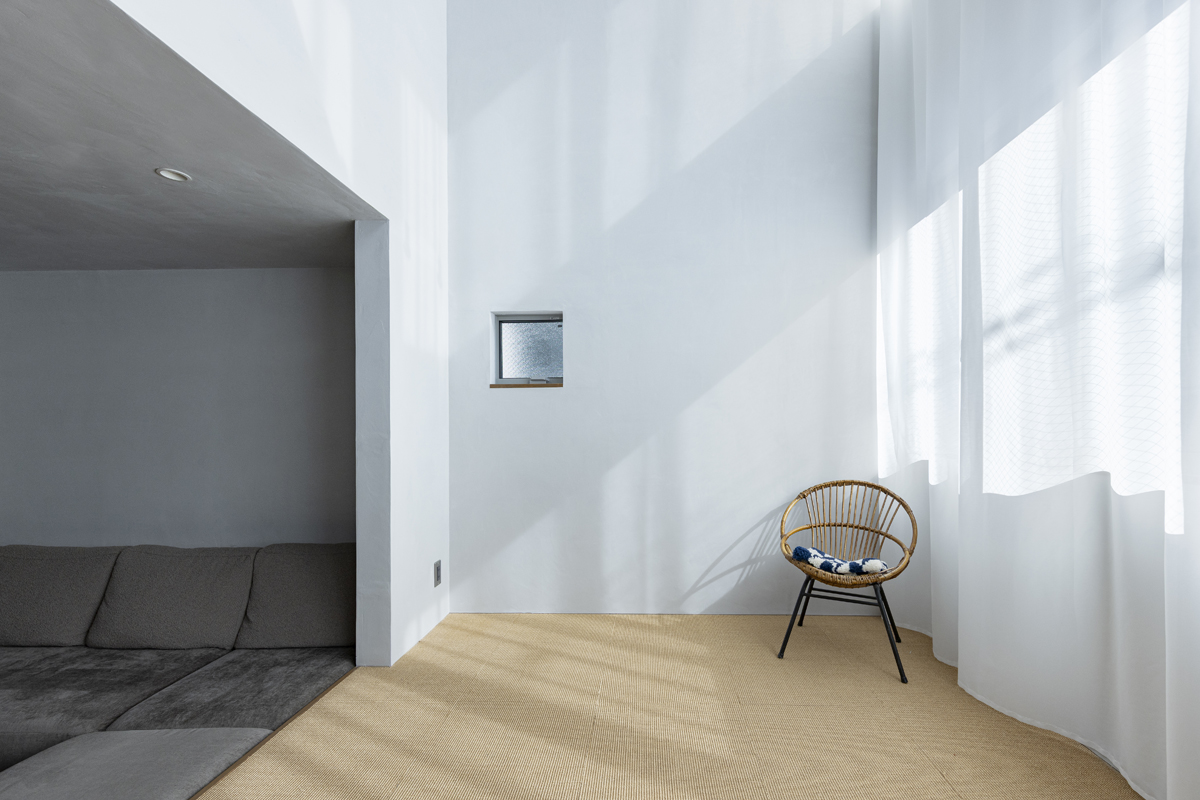 建築の外形は勾配屋根をもつイエ型とはせずに、シンプルな整形立方体のハコ型とした。それは多様な建物が点在するこの地において、そして現代の見世蔵として、一見してプライバシー性の高い戸建て住宅であることを認識し難くするとともに、将来、ギャラリーやショップに転用した時の姿として相応しいと考えたからである。